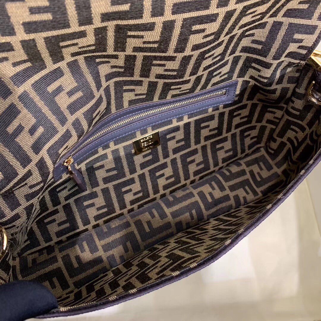 - 100% jacquard fabric - Adjustable handle - Customized shoulder strap with Fendi Label motif in the same tones - Flap and FF fastening with magnetic clasp - Gold-finish metalware - Interior 1 zip pocket