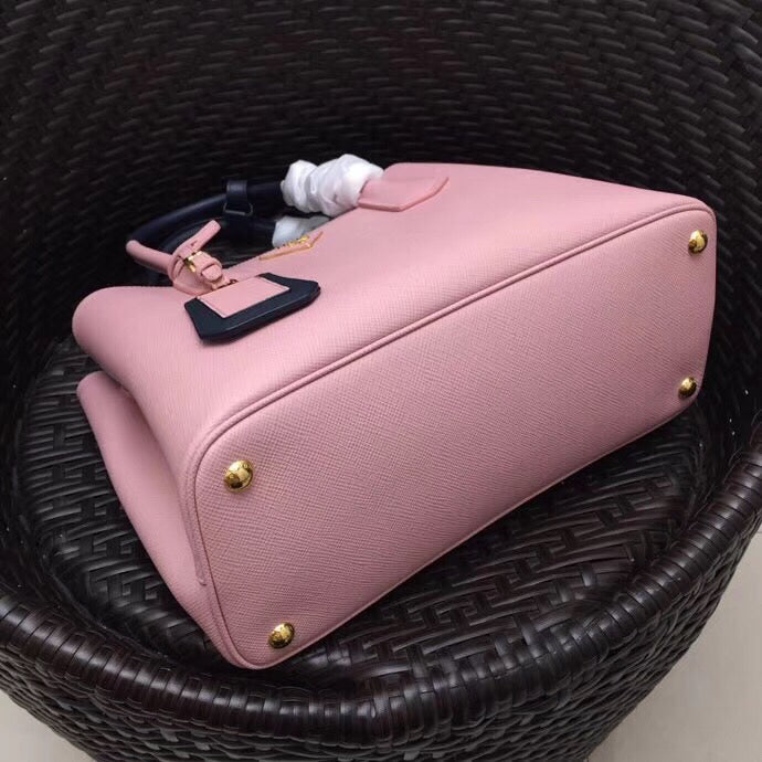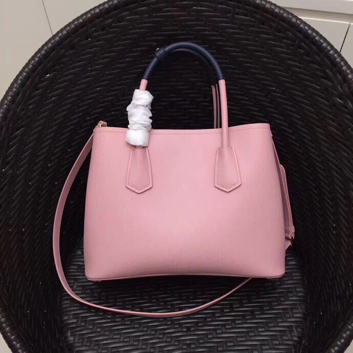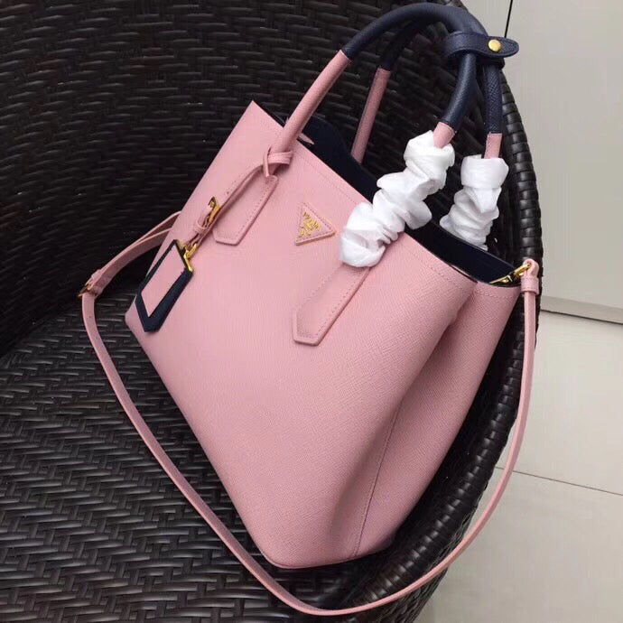 - Saffiano leather with two-tone handles and name tag - Double leather handle - Detachable adjustable leather shoulder strap - Steel hardware - Metal lettering logo on leather triangle - Snap closure on sides - One inside flap pocket - Nappa leather lining